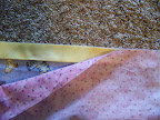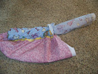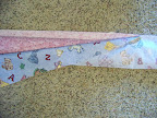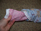 Now,just take the body section (pink) and roll it up (like a burrito) until you can see the trim piece from underneath. This insures that no rolled edge gets accidentally sewn in. The roll is simply encased within, except at the one top seamed edge!